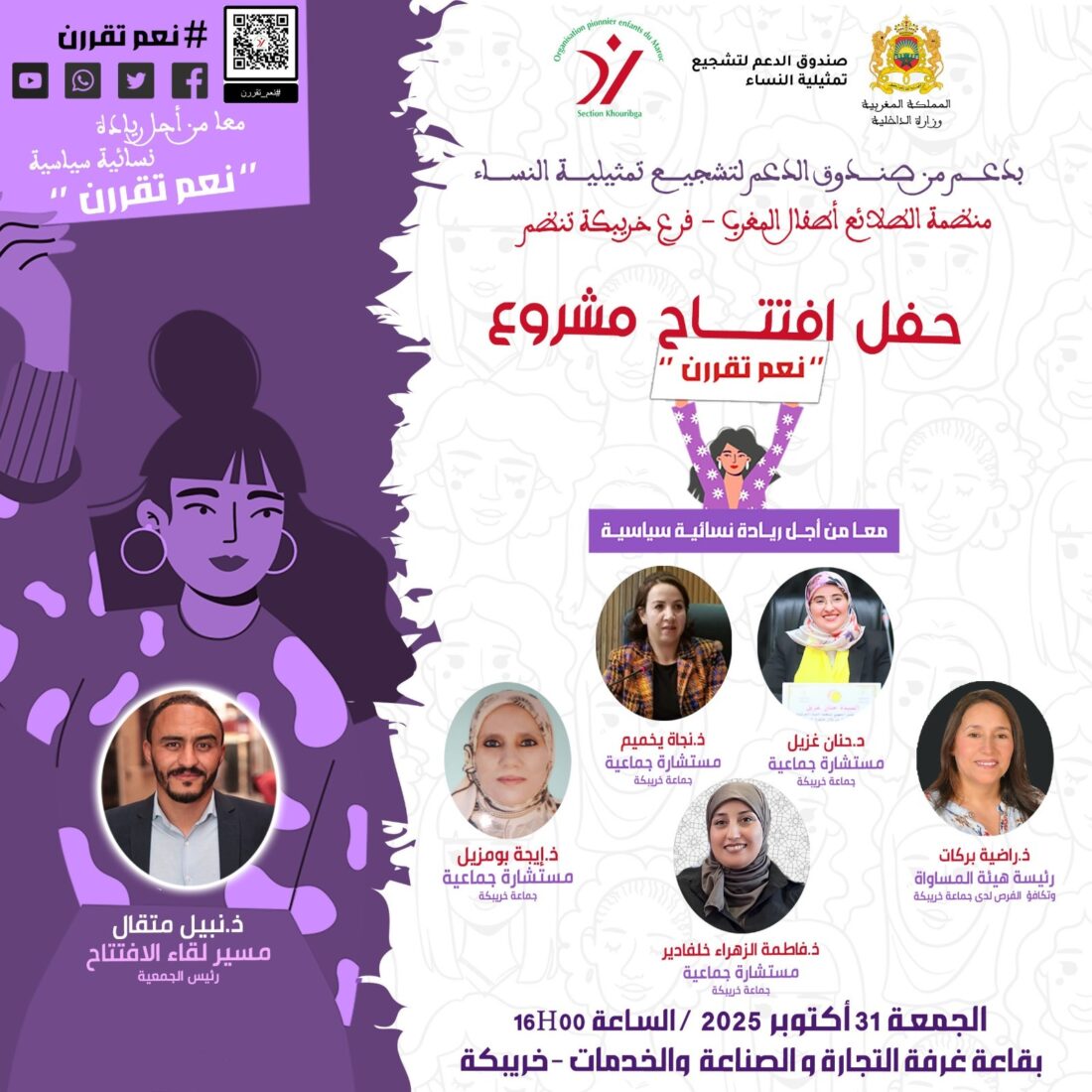 في إطار الجهود الوطنية الرامية إلى تشجيع تمثيلية النساء وتمكينهن سياسياً، تستعد منظمة الطلائع أطفال المغرب – فرع خريبكة، بدعم من صندوق الدعم لتشجيع تمثيلية النساء التابع لوزارة الداخلية، لتنظيم حفل افتتاح مشروع “نعم نقررن”، وذلك يوم الجمعة 31 أكتوبر 2025 على الساعة الرابعة مساءً بقاعة غرفة التجارة والصناعة والخدمات بخريبكة، تحت الإشراف المباشر لرئيس الفرع الأستاذ نبيل متقال.