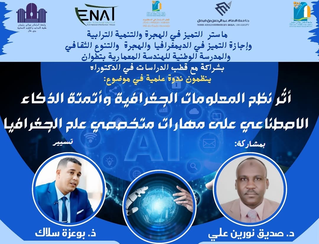 ينظم ماستر الهجرة والتنمية الترابية، بتعاون مع قطب الدراسات في الدكتوراه، والمدرسة الوطنية للهندسة المعمارية بتطوان، وبتنسيق مع جامعة الإمام عبد الرحمن بن فيصل، ندوة علمية عن بعد في موضوع: “أثر نظم المعلومات الجغرافية وأنظمة الذكاء الاصطناعي على مهارات متخصصي علم الجغرافيا”، وذلك يوم الأربعاء 21 ماي 2025، على الساعة الرابعة بعد الزوال.